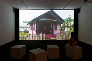 Holzfeind's slide projection "A house is a house is..." shows wide angle and close up views of buildings and their surroundings which were (re)built in the aftermath of the 2004 Tsunami in Thailand, Banda Aceh, Sri Lanka and the Maldives.